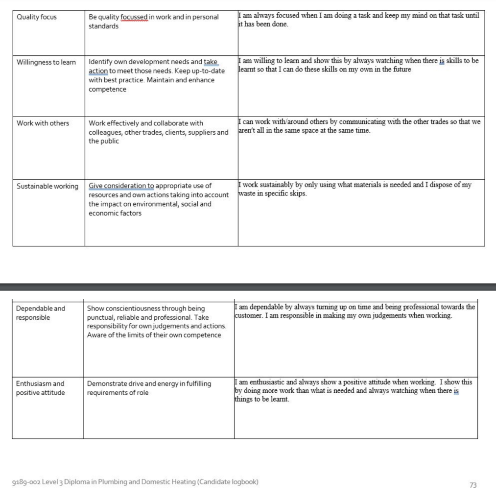 Below is an example of an apprentices effort at completing a behaviours checklist part of the way through their studies, if an apprentice completed these documents regularly they themselves would be able to see their journey too.