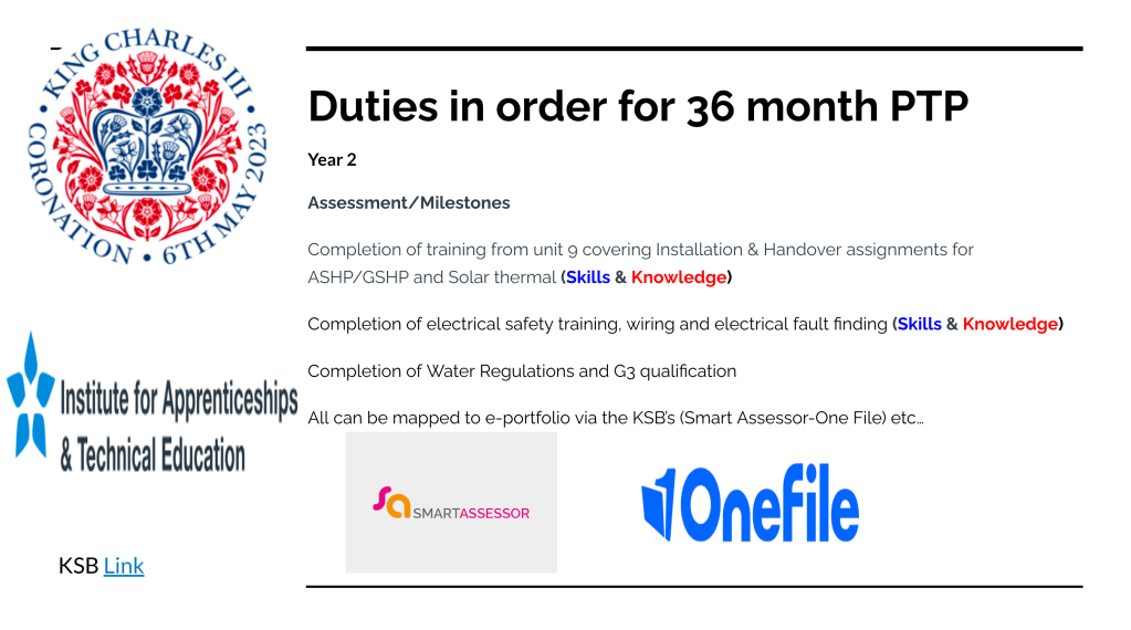 The practical training will be carried out over three phases (years) see the images below that outline the process and when, where and how to apply. It is important to offer KSB’s throughout the 3 phases. For example beginning with Basic skills across BSE and leading into basic design across the three technologies (phase 1), (phase 2) Install the tree technologies and (phase 3) fault find, commission and handover of the three technologies. An example of the process can be seen in the tables below.