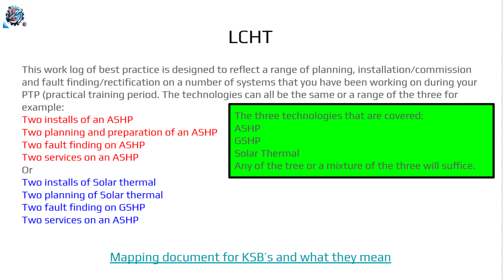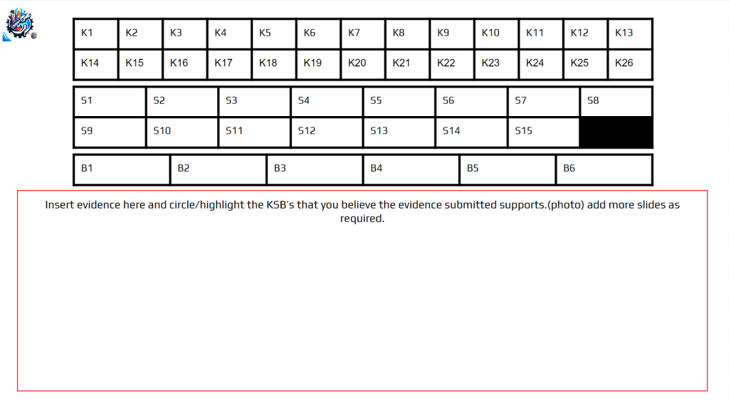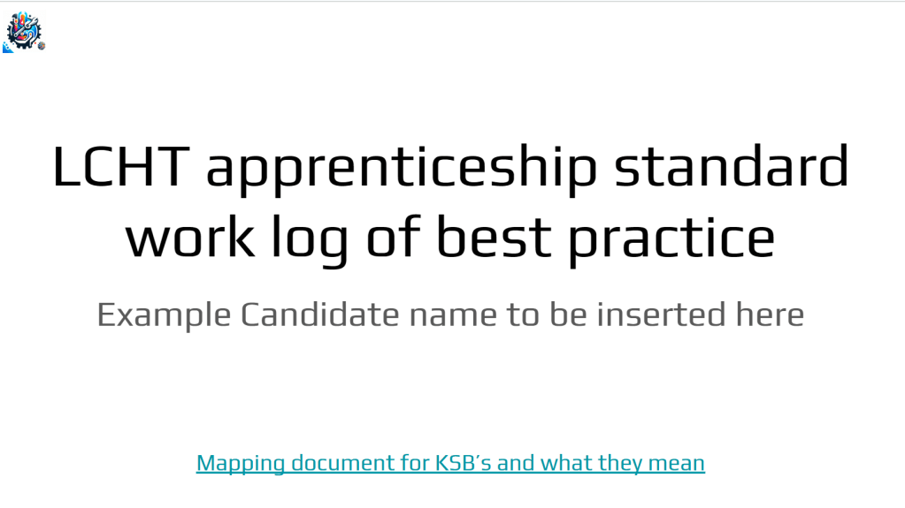 During the apprentices PTP (practical training period) it will be expected that all will be able to collate a work log of best practice evidencing their skills in the workplace. All of the evidence supplied must be mapped to meet the KSB’s and be vetted by the training centres to make sure the apprentice has met the full range expected from the apprenticeship standard. To assist the apprentices in this I have designed a range of slides that the apprentice can record and map their progress in centre and on-site. Below are some images of the slides that the apprentice can edit, either with photos, videos, written reflective accounts, expert witness statements, audio recordings and other types of supplementary evidence to show they have met the range of work and KSB’s within that piece of work.