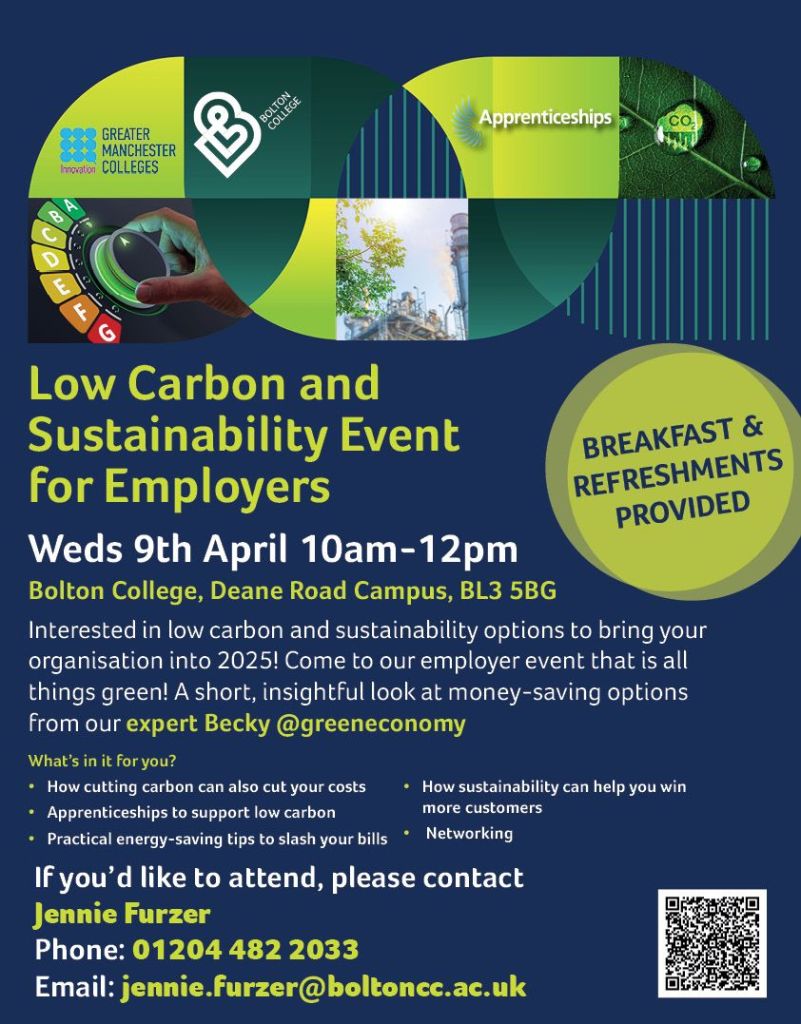 Bolton College – Sustainability event that took place at the college on the 9th of April 2025, bringing together employers, educators and Green Economy experts to discuss the benefits of the Low Carbon Heating apprenticeship standard and how it could assist their businesses and much much more.