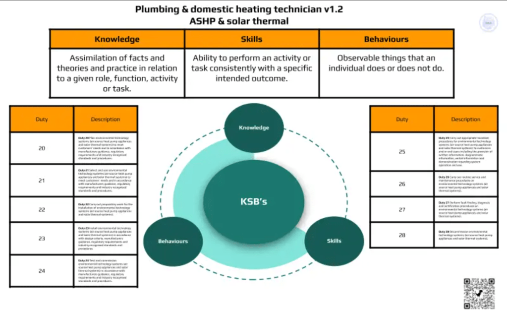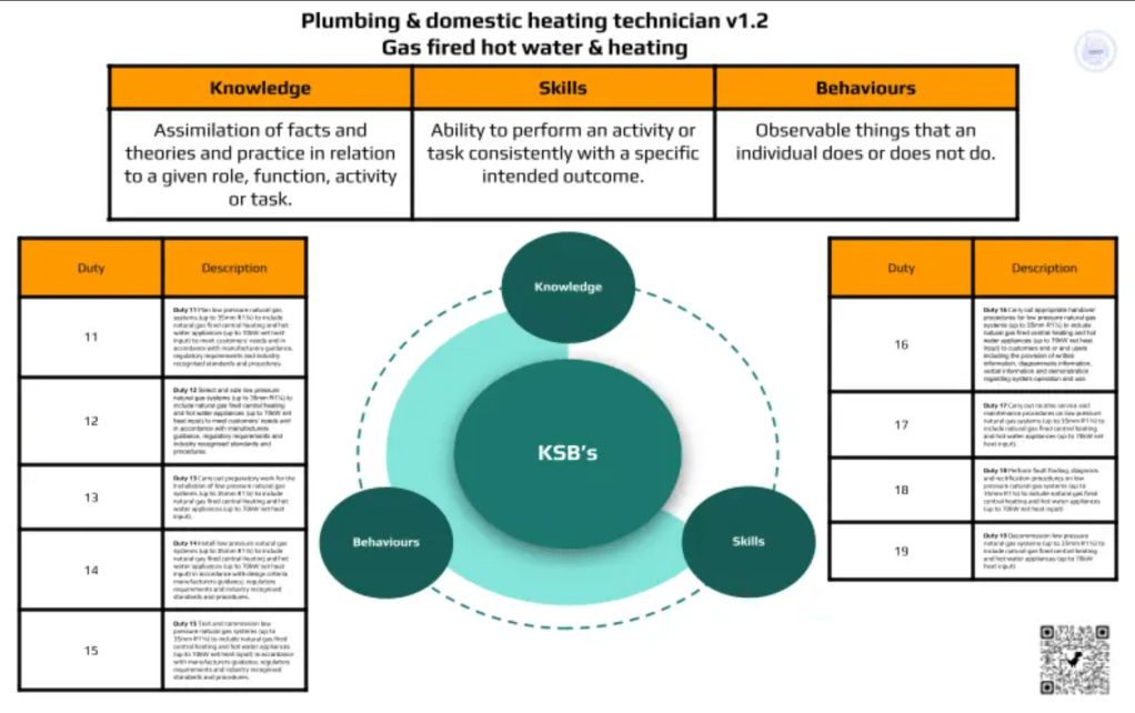 All of the duties for each element of the apprenticeship standard are featured above in the three images, with a QR code to the KSB’s linked to each duty. This assisted me in the development of the training plan for the core plumbing and both of the pathways.