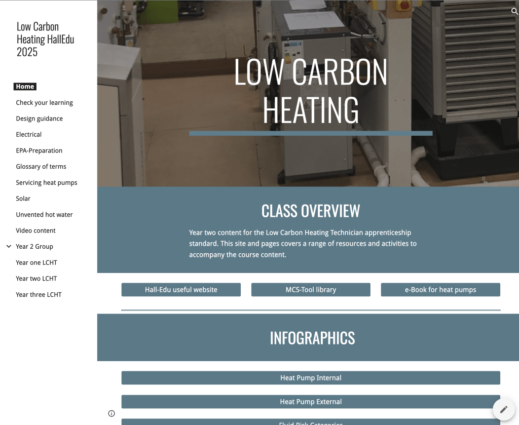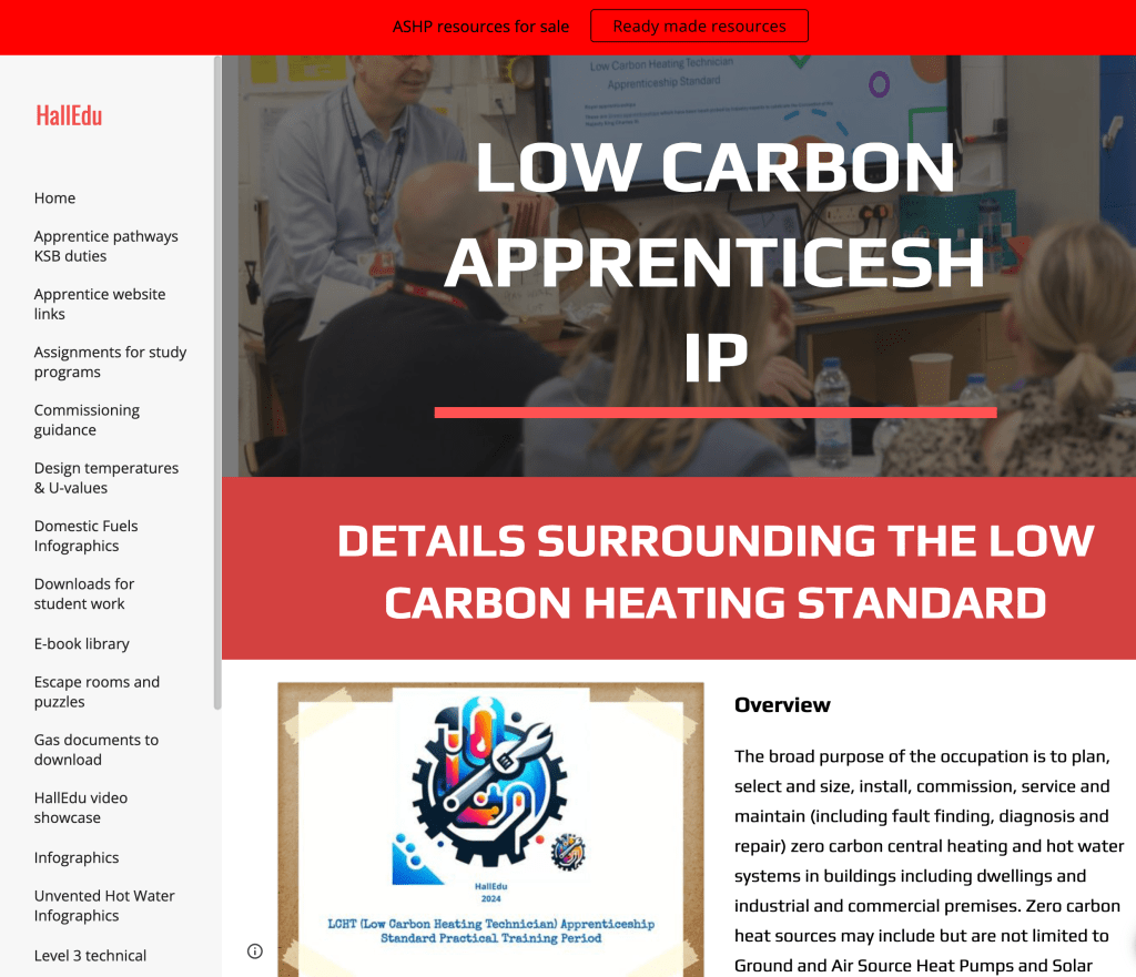 - Low Carbon Heating Technician, apprenticeship standard just continues to grow and become more popular. We now have two groups of low carbon apprentices. They study the content that has been developed to meet the employers’ requirements. The content also addresses the needs of the industry. All content meets the duties and the knowledge, skills and behaviours to enable the students to meet the requirements. This course too has a bespoke website and access to http://www.halledu.co.uk to assist the students in and out of college.